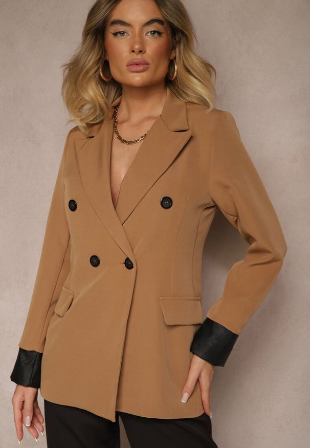 Renee - Brązowa Marynarka Dwurzędowa o Kroju Oversize Clasora. Typ kołnierza: golf. Kolor: brązowy. Materiał: poliester. Styl: klasyczny