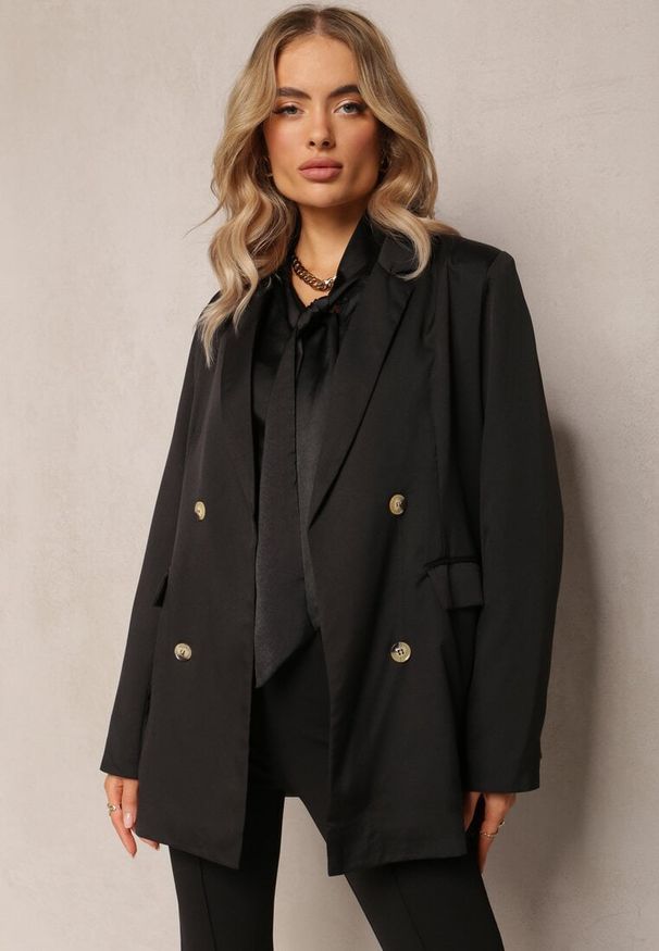 Renee - Czarna Dwurzędowa Marynarka z Błyszczącą Nicią i Poduszkami na Ramionach Elilona. Kolor: czarny. Materiał: dzianina. Długość rękawa: długi rękaw. Długość: długie. Styl: klasyczny