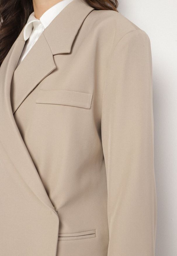 Renee - Beżowa Marynarka z Usztywnionymi Ramionami i Imitacją Kieszeni Halonia. Okazja: na co dzień, na spotkanie biznesowe. Kolor: beżowy. Materiał: jeans. Styl: biznesowy, klasyczny, casual, elegancki