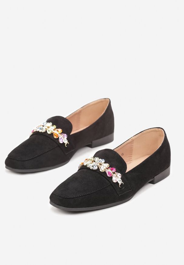 Renee - Czarne Płaskie Mokasyny z Kwadratowym Noskiem Ozdobionym Kryształkami Celeshta. Kolor: czarny. Wzór: aplikacja. Styl: elegancki