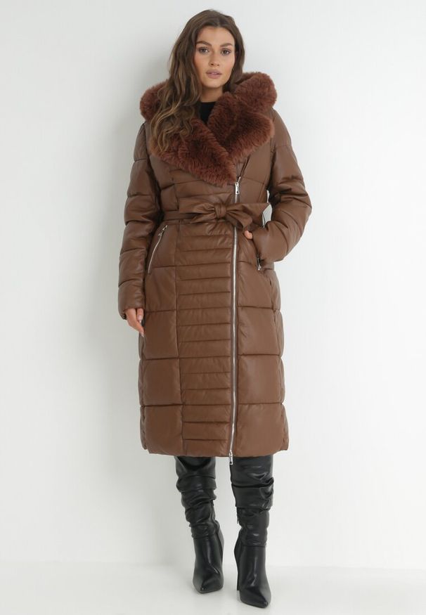 Born2be - Zielona Kurtka Długa Pikowana Płaszcz z Imitacji Skóry z Futerkiem Sezee. Kolekcja: dla wysokich. Kolor: zielony. Materiał: skóra, futro. Długość: długie. Sezon: zima, jesień