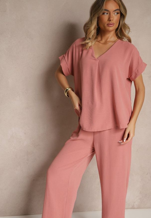 Renee - Różowy Komplet Top Bandeau Zdobiony Guzikami i Spodnie o Szerokim Kroju Palarienna. Kolor: różowy. Wzór: aplikacja