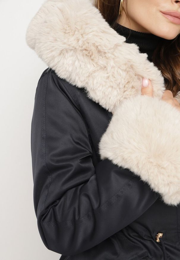 Born2be - Czarna Klasyczna Kurtka Parka z Kapturem i Ściągaczem w Pasie Cinelle. Okazja: na co dzień. Typ kołnierza: kaptur. Kolor: czarny. Materiał: skóra, jeans. Styl: klasyczny