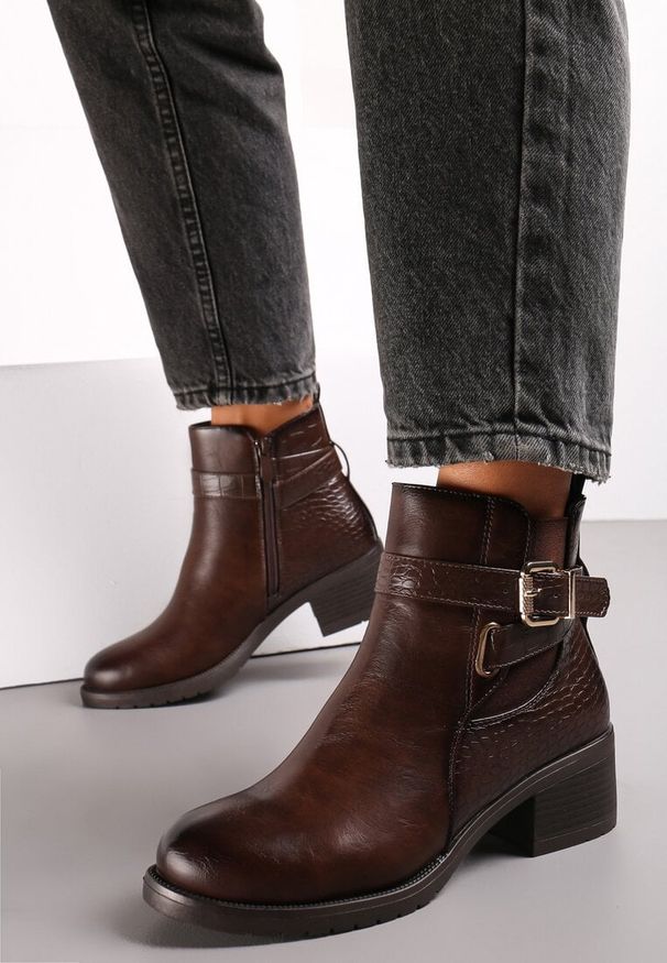 Born2be - Ciemnobeżowe Płaskie Botki w Stylu Sztybletów z Tłoczoną Podeszwą Lemilaine. Okazja: na co dzień, do pracy, na spotkanie biznesowe. Kolor: beżowy. Materiał: jeans. Styl: biznesowy, casual, elegancki
