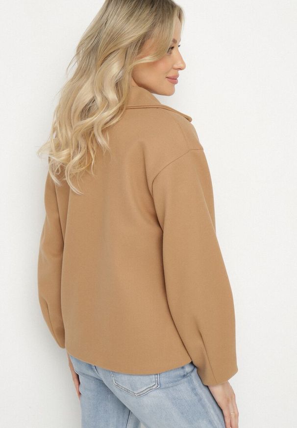 Renee - Beżowy Płaszcz z Wiązanym Paskiem i Bufiastym Rękawem Agnage. Typ kołnierza: kołnierzyk stójkowy. Kolor: beżowy. Materiał: jeans, tkanina. Sezon: jesień, wiosna