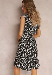 Czarna Wiskozowa Sukienka o Rozkloszowanym fasonie z Metalicznym Nadrukiem Aurasana. Letnia, wiskozowa sukienka Aurasana posiada elastyczną gumkę w pasie (po rozciągnięciu: S/M 97 cm, L/XL 101 cm). Na dole wykończona falbankami, brak podszewki. Oryginalny, metaliczny print w kwiaty.