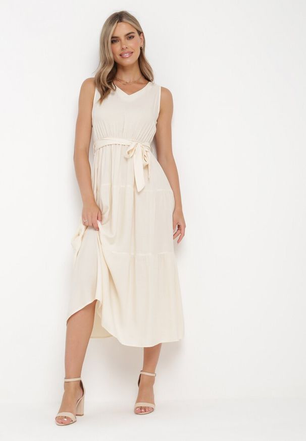 Beżowa Wiskozowa Sukienka Midi z Gumką w Pasie i Materiałowym Paskiem Bicuh. Rozkloszowana sukienka Bicuh z wiskozowej tkaniny. W pasie wszyta gumka (po rozciągnięciu ma wymiar dla rozmiarów S/M - 95 cm, L/XL - 99 cm). Dodatkowo wiązana materiałowym paskiem. Nie posiada podszewki. Świetnie prezentuje się w połączeniu z sandałami na słupku.