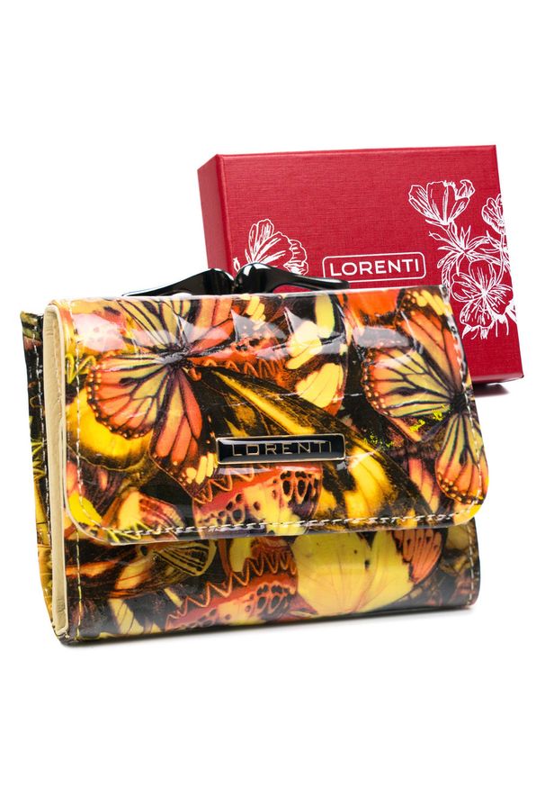 Portfel skórzany Lorenti 55287-13 print motyle. Niewielki portfel damski ze skóry naturalnej pokrytej printem z motylami. Wyposażony w zakładkę na kartę oraz kieszeń na banknoty. Portmonetka zewnętrzna, zamykana biglem. Akcesorium z systemem RFID Protect. Zapakowane w oryginalne pudełko producenta.
