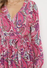 Ciemnoróżowa Plisowana Sukienka z Gumką w Pasie i Wzorem Paisley Carella. Sukienka Carella o długości maxi, z plisowanym dołem i kopertowym dekoltem. Zdobiona stylowym wzorem paisley. W pasie wszyta gumka, dodatkowo wiązana materiałowym paskiem. Bez podszewki. Gumka w pasie po rozciągnięciu mierzy: M/L - 103 cm, XL/XXL - 107 cm.