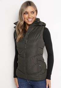 Ciemnozielona Kamizelka Pikowana Zapinana na Suwak z Kapturem i Kieszeniami Fevenella. Kamizelka Fevenella pikowana, zapinana na zamek błyskawiczny, kaptur odpinany, kieszenie zapinane na suwaki.