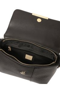 Czarna torebka na ramię z odpinanym pomponem. Torebka wykonana z wysokiej jakości skóry licowej w klasycznym czarnym kolorze, który pięknie komponuje się ze złotymi detalami. Jej fason przypomina klasyczną listonoszkę, dzięki czemu pasuje do wielu smart casualowych stylizacji. Pojemne wnętrze pomieści wiele drobiazgów potrzebnych każdego dnia. Zapięcie w formie klapy na zatrzask dodatkowo zamykane jest na błyskawiczny zamek. Uwagę przykuwa odpinany pompon, który nadaje całoś