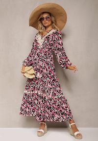 Renee - Fuksjowa Rozkloszowana Sukienka z Gumką w Pasie i Ażurową Wstawką Margotta. Kolor: różowy. Wzór: ażurowy #4