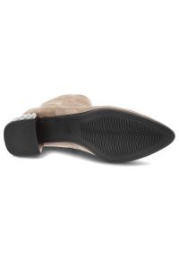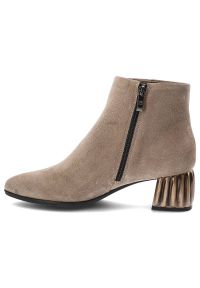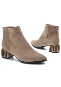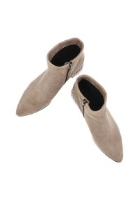 Beżowe Botki Espirito Damskie Modne Buty Na Obcasie. Oto botki ESPIRITO - B-488/3 Beż WK203 w odcieniu subtelnej beży, które wprowadzają element wyrafinowania do każdej garderoby. Te buty zostały wykonane z miękkiego zamszu, który doskonale komponuje się z różnorodnymi stylizacjami, od casualowych po bardziej formalne. Ich gładka faktura oraz delikatny kolor nadają im klasy i elegancji. Botki ESPIRITO - B-488/3 Beż WK203 wyróżnia unikatowy, ręcznie rzeźbiony obcas w kolorze czekolady, który stanowi nie tylko stabilne oparcie, ale także jest wyjątkowym elementem ozdobnym. Ostrzejsza linia noska butów nadaje im nowoczesnego charakteru, a subtelny, wewnętrzny zamek ułatwia zakładanie. Botki ESPIRITO - B-488/3 Beż WK203 są idealnym wyborem dla tych, którzy szukają obuwia łączącego komfort z subtelną estetyką. Dzięki swojej wszechstronności, będą one doskonale pasować zarówno do dżinsów, jak i eleganckich sukienek, zapewniając wygodę oraz styl na każdą okazję.