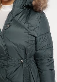 Zielona Pikowana Kurtka przed Kolano ze Ściągaczem i Kapturem z Futerkiem Lemeki. Pikowana Kurtka Lemeki przed kolano, ze ściągaczem w talii. Posiada odpinany kaptur z imitacją futerka. Zapinana na zamek błyskawiczny ukryty pod plisą na napy. Wsuwane kieszenie na napy na wysokości bioder.