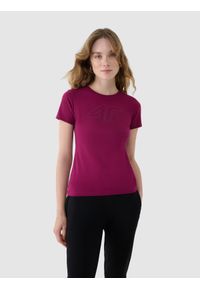 4f - 4F T-shirt slim z nadrukiem damski - różowy M. Okazja: na co dzień. Kolor: różowy. Materiał: elastan, bawełna, materiał, dzianina, jersey. Wzór: nadruk. Styl: klasyczny, casual, sportowy