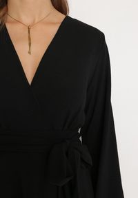 Czarna Kopertowa Sukienka Kombinezon Mini z Falbanką Bomina. Kombinezon Bomina o długości mini i rozkloszowanym kroju. Dekorowany u dołu falbankami. Góra kopertowa. Na plecach subtelne rozcięcie i zapięcie na guzik. Z tyłu w pasie wszyta marszczona gumka. Dodatkowo wiązany materiałowym paskiem.