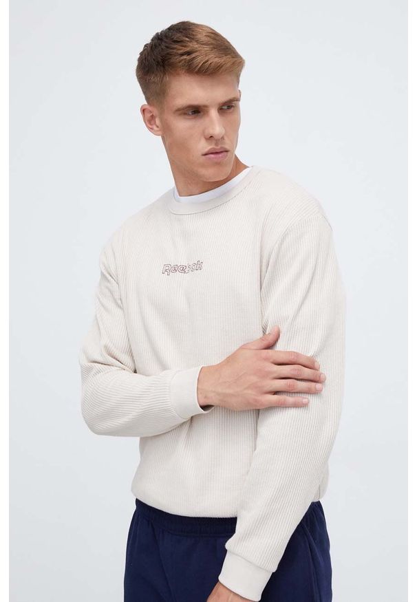 Reebok bluza męska kolor beżowy gładka. - Fason oversize.- Krój rękawa z obniżoną linią ramion nie ogranicza mobilności.- Klasyczny, okrągły dekolt.- Cienka, elastyczna dzianina.- Rękawy i dolna krawędź wykończona wygodnym, elastycznym ściągaczem.- Długość rękawa: 86 cm.- Długość: 72 cm.- Szerokość pod pachami: 60 cm.- Wymiary podane dla rozmiaru: M.