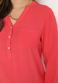 Czerwona Bluzka Nilmeatei. Bluzka Nilmeatei z trójkątnym dekoltem zapinanym na guziki oraz imitacją stójki. Z długimi rękawami, które możesz nosić także podpięte. Na biuście umiejscowiono otwartą kieszonkę. To wygodna, casualowa bluzka, która będzie idealna do półformalnych looków!