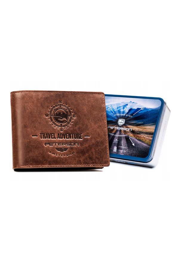Tłoczony portfel j. brązowy Peterson PTN N992-BE-TRAV. Portfel odszyty z trwałej skóry naturalnej. Model o klasycznej stylistyce. Portfel w orientacji poziomej bez zapięcia zewnętrznego. Posiada rozbudowane wnętrze. Wyposażony w technologię RFID BLOCKING SYSTEM.