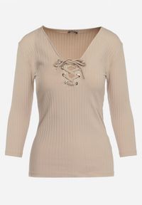 Beżowa Bawełniana Bluzka w Prążki z Gorsetowym Wiązaniem Przy Dekolcie Jarelis. Bluzka Jarelis wykonana z prążkowanej bawełny. Przy głębokim dekolcie znajduje się wiązanie w gorsetowym stylu. Rękawy o długości 3/4. Świetnie komponuje się z jeansami i skórzanymi spodniami.