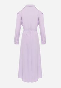 Jasnofioletowa Rozkloszowana Sukienka Maxi z Koszulową Górą i Wiązanym Paskiem Indiga. Sukienka Indiga rozkloszowana u dołu, zapinana u góry przy dekolcie na ozdobne, metalowe guziki. Rękaw 3/4 z możliwością podciągnięcia i zapięcia na metalowy guzik. Dołączony dodatkowo materiałowy pasek w jednolitym kolorze sukienki. Sukienka bez podszewki.