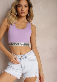 Jasnofioletowy Top Sportowy Biustonosz Elastyczny Prążkowany z Ozdobną Gumą Waslema. Materiał o dobrej elastyczności zapewnia odpowiednie dopasowanie do kształtu ciała i umożliwia swobodne wykonywanie ruchów podczas aktywności fizycznej. Fason posiada wszyte miseczki.