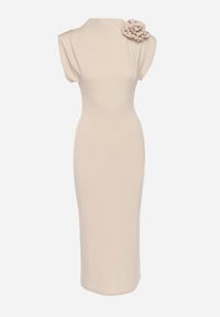 Beżowa Sukienka Midi Dopasowana z Ozdobną Broszką w Kształcie Kwiatka Agnolia. Tego rodzaju sukienka może być zestawiona z klasycznymi szpilkami lub sandałami na obcasie dla bardziej formalnego looku. Dobierz do nich dopasowaną torebkę i ruszaj na każdy event!