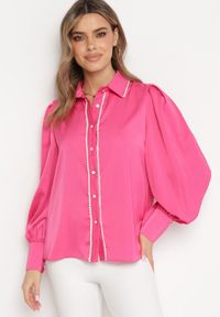 Fuksjowa Koszula z Bufiastymi Rękawami Zapinana na Guziki Ozdobiona Koralikami Torlee. Koszula Torlee zapinana na guziki, ozdobiona koralikami — basic w modnym wydaniu!