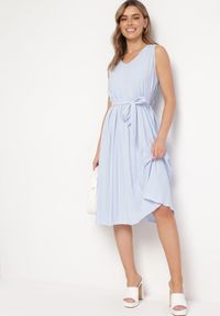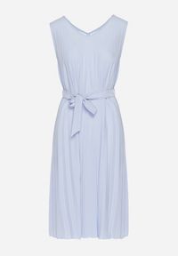 Jasnoniebieska Rozkloszowana Sukienka Midi Plisowana z Materiałowym Paskiem Varethia. Materiałowy pasek, którym jest ozdobiona sukienka Varethia, nadaje jej dodatkowego wyrazu, podkreślając talię i podkreślając sylwetkę. Jest to również praktyczny element, który pozwala na dostosowanie sukienki do indywidualnych preferencji.