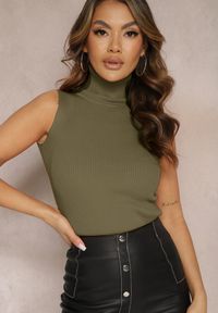 Zielona Khaki Bluzka z Elastycznego Materiału bez Rękawów z Golfem Merdia. Golf dodaje bluzce elegancji i subtelności, a brak rękawów nadaje jej lekkości i letniego charakteru. Można ją nosić solo jako główny element stroju lub zestawiać z różnymi dodatkami.