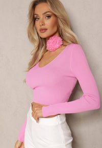 Renee - Fuksjowa Prążkowana Bluzka o Krótkim Fasonie Choker z Kwiatem w Komplecie Laindera. Typ kołnierza: choker. Kolor: różowy. Materiał: prążkowany. Długość: krótkie. Wzór: kwiaty. Styl: elegancki #4