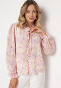 Born2be - Różowa Koszula z Delikatnym Kwiatowym Wzorem i Wiązaniem Przy Dekolcie Viralla. Kolor: różowy. Wzór: kwiaty. Styl: retro, elegancki #6