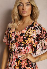 Renee - Czarno-Różowa Bawełniana Sukienka Letnia Ozdobiona Kolorowym Wzorem Boho z Gumką w Pasie Pythia. Kolor: czarny. Materiał: bawełna. Wzór: kolorowy, aplikacja. Sezon: lato. Styl: boho #4