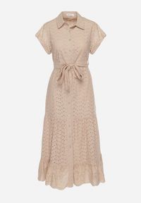 Beżowa Sukienka Bawełniana z Ażurowym Wzorem i Wiązanym Paskiem Kelilena. Sukienka Kelilena to kwintesencja kobiecości przełamanej nutą retro. Jej ażurowy wzór zachwyca delikatnością. Lekko rozkloszowany dół komponuje się z krótkimi rękawami, tworząc harmonijną całość. Naturalny materiał z podszewką sprawia, że jest wyborem idealnym na każdą porę roku, a wiązany pasek akcentuje talię, dając możliwość dopasowania do indywidualnych preferencji. Na co dzień załóż ją do sandałów gladiatorek i kapelusza z szerokim rondem, a wieczorem przemień w elegancką kreację dodając szpilki i minimalistyczną biżuterię.