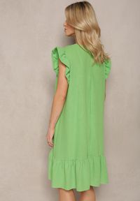 Jasnozielona Sukienka o Rozkloszowanym Kroju z Krótkim Rękawem i Falbankami Lavolia. Odkryj urok sukienki Lavolia o rozkloszowanym kroju, która nada lekkości Twoim ruchom i podkreśli zdobieniami każdą sylwetkę. Elegancka linia z krótkim rękawem i subtelne falbanki na dole tworzą wystarczająco wyrazisty akcent na co dzień, jak i na wyjątkowe okazje. Okrągły dekolt o umiarkowanej głębokości to klasyka, która nigdy nie wychodzi z mody. Łącząc ją z botkami i ramoneską uzyskasz swobodny look, zaś dodając szpilki i delikatną biżuterię, przemienisz się w ikonę wieczorowych wydarzeń.