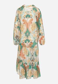 Beżowo-Zielona Rozkloszowana Sukienka z Długim Rękawem i Falbankami Amollas. Odnajdź swój styl z rozkloszowaną sukienką Amollas, która łączy w sobie modne falbanki z klasycznym krojem. Długość rękawa sprawia, że jest idealnym wyborem na każdą porę roku, a delikatny dekolt dodaje subtelności i kobiecości. Nie posiada podszewki. Zdobiona wzorem, który przyciąga wzrok, będzie doskonałym wyborem zarówno na spotkanie ze znajomymi, jak i na romantyczną kolację — zestaw ją z botkami i ramoneską na co dzień lub dodatkami w odcieniu złota na wieczór. Wygodna, uniwersalna i pełna uroku — to sukienka, którą pokochasz od pierwszego założenia!