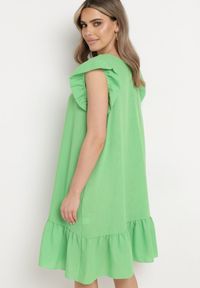 Jasnozielona Rozkloszowana Sukienka z Falbanką na Dole i przy Rękawach Biojara. Oto sukienka Biojara, która wprowadzi szczyptę elegancji do Twojej garderoby, niezależnie od okazji. Charakteryzuje się rozkloszowanym fasonem, który pięknie zaakcentuje Twoją sylwetkę, a delikatne falbanki przy rękawach i na dole kreacji dodają jej dziewczęcego uroku. Dekolt o optymalnej głębokości pięknie wyeksponuje szyję i nada stylizacji odpowiednią dozę wyrafinowania. Sukienka z krótkim rękawem sprawdzi się zarówno na codzienne wyjścia, jak i na szczególne okazje.