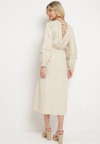 Beżowa Bawełniana Sukienka z Koronkowymi Akcentami z Gumką w Pasie i Materiałowym Paskiem Jariena. Odkryj swoją nową ulubioną sukienkę Jariena, która zachwyca fasonem z koronkowymi akcentami. Subtelność linii i gumka w pasie sprawiają, że model pięknie dopasowuje się do sylwetki, a dołączony materiałowy pasek pozwala na dodatkowe podkreślenie talii. Urokliwy dekolt w kształcie litery V z delikatnymi zdobieniami dodaje całości elegancji, a długość rękawa sprawia, że sukienka idealnie nadaje się na rozmaite okazje. Wymiary gumki w pasie po rozciągnięciu: S/M - 89 cm, M/L - 96 cm.