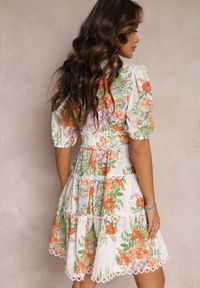 Biało-Granatowa Kwiecista Sukienka z Bawełny z Gumkami w Pasie Herata. Sukienka Herata to kwintesencja wiosennej lekkości i dziewczęcego uroku, idealna na pikniki jak i garden party. Delikatny kwiecisty wzór sprawia, że jej właścicielka rozkwita w każdym otoczeniu, a gumka w pasie pięknie akcentuje talię, podkreślając kobiece kształty. Dekolt o optymalnej głębokości czaruje subtelną elegancją, a krótkie, bufiaste rękawy dodają swobodnego charakteru. Wykonana z oddychającej bawełny, zapewnia komfort przez cały dzień, a jej uniwersalność pozwala na łączenie z lekkimi trampkami dla casualowego looku.