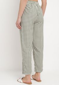 Zielono-Białe Spodnie z Wysokim Stanem i Gumką w Pasie Korolla. Spodnie Korolla to nie tylko wygodne, ale i stylowe rozwiązanie dla każdej kobiety, która ceni sobie modowe nowinki oraz klasykę. Ich fason rewelacyjnie podkreśla sylwetkę dzięki wysokiemu stanowi, a elastyczna gumka w pasie zapewnia komfort noszenia. Posiadają także praktyczne wsuwane kieszenie. Idealne na co dzień, świetnie skomponują się z luźnym T-shirtem i sneakersami lub z taliowanym kardiganem i balerinkami i paskiem. Te spodnie zdobione nowoczesnym wzorem to must-have w Twojej szafie, który pozwoli Ci na tworzenie wielu modnych stylizacji na każdą okazję!