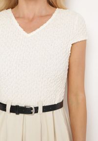 Beżowa Rozkloszowana Sukienka z Paskiem z Imitacji Skóry Drinna. Odkryj urok rozkloszowanej sukienki Drinna, która zachwyca eleganckim fasonem z subtelnym dekoltem w kształcie litery V. Krótkie rękawy sprawiają, że jest idealna na cieplejsze dni, a unikalne zdobienia na górze dodają jej charakteru. Skórzany pasek subtelnie podkreśla talię, nadając sylwetce smukły kształt. To ponadczasowy wybór na różnego rodzaju okazje. Załóż ją z płaskimi sandałami dla swobodnego looku lub z eleganckimi szpilkami, kreując wyrafinowaną stylizację na wieczorną okazję.