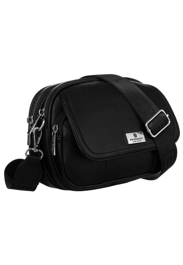 Listonoszka damska Peterson PTN 074-02 czarna. Torebka została wykonana z wysokiej klasy skóry ekologicznej. Listonoszka posiada dwie pojemne komory i cztery dodatkowe kieszenie. Dla większego komfortu użytkowania w tym modelu zastosowaliśmy szeroki i odpinany pasek z szybką regulacją długości.