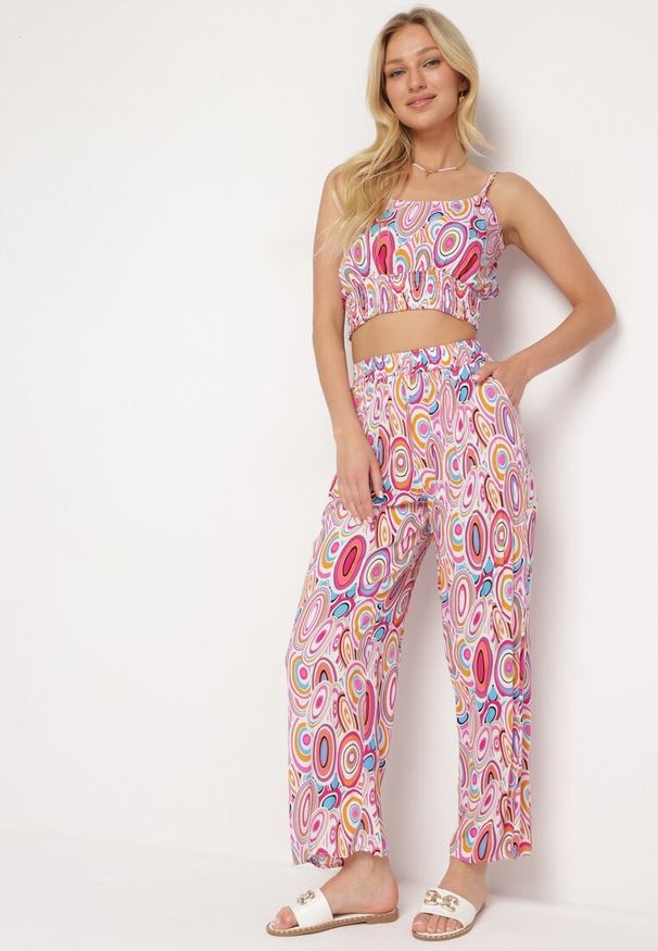 Różowy Boho Komplet z Wiskozy Top na Ramiączkach z Gumką Szerokie Spodnie Palazzo Lereri. Komplet Boho z Wiskozy Lereri - stylowe połączenie topu na ramiączkach z komfortową gumką i szerokich spodni typu palazzo, który zapewnia swobodę ruchów i wygodę noszenia. Wykonany z przyjemnej dla skóry wiskozy, idealnie wpisuje się w letnie klimaty, a jego elastyczność gwarantuje idealne dopasowanie. Efektowny wzór kompletu sprawdzi się zarówno podczas codziennego spaceru, jak i na specjalnych okazjach – wystarczy dodać eleganckie sandały i minimalistyczną biżuterię.