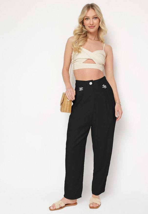 Czarne Spodnie Paper Bag z Wysokim Stanem i Cyrkoniami Uzilina. Spodnie Paper Bag z Wysokim Stanem i Cyrkoniami Uzilina to must-have w szafie każdej fashionistki. Ich klasyczny krój z wysokim stanem na guzik i suwak doskonale podkreśla talię, a zwężana nogawka dodaje elegancji, co czyni je idealnymi zarówno na co dzień, jak i na formalne okazje. Zdobienia w postaci cyrkonii nadają im unikalnego charakteru, który świetnie komponuje się z oversizową bluzą lub elegancką koszulą. Stylizując je na co dzień, postaw na białe sneakersy, a na wieczorne wyjście wybierz szpilki i delikatną biżuterię – efekty wow gwarantowane! Ich wsuwane kieszenie to praktyczne rozwiązanie.
