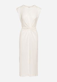 Jasnobeżowa Sukienka z Marszczonej Tkaniny Ozdobiona Imitacją Węzła z Rozcięciem Risley. Sukienka Risley z poduszkami na ramionach to wykwintne połączenie klasyki z nowoczesnymi trendami. Subtelne marszczenia i imitacja węzła dodają tej kreacji nonszalanckiego uroku, a strategicznie umieszczone rozcięcie podkreśla kobiece kształty, zachowując przy tym elegancki charakter. Fason z lekko podkreśloną talią idealnie sprawdzi się na różnorodne okazje - od popołudniowej kawy po wieczorne wyjście. Ażurowy wzór zapewni stylowy look, który z łatwością można dopasować zarówno do casualowych trampek, jak i wytwornych szpilek.