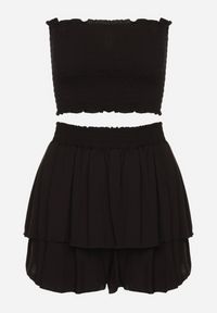 Czarny Bawełniany Komplet Krótki Top bez Ramiączek Szorty z Gumką w Pasie i Falbanką Tesmara. Odkryj wyjątkowy komplet Tesmara wykonany z bawełny. Krótki top bez ramiączek idealnie eksponuje ramiona, a szorty z elastyczną gumką w talii i falbanką dodają całości uroku. Stylizuj go na co dzień z espadrylami i plecioną torbą lub uzupełnij wiązanymi sandałami i delikatną biżuterią na wieczorne wyjście. Efekt wow gwarantowany!