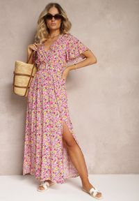 Różowa Kopertowa Sukienka z Wiskozy z Materiałowym Paskiem i Gumką w Talii z Rozcięciem Vikali. Ta kopertowa sukienka z wiskozy to prawdziwy must-have dla każdej modnej kobiety! Zaprojektowana z myślą o wygodzie i stylu, delikatnie podkreśla talię dzięki gumce i materiałowemu paskowi. Krój sukienki magazynuje kobiecą sylwetkę, a subtelny dekolt w kształcie litery V dodaje uroku. Krótkie rękawy sprawiają, że kreacja jest idealna na cieplejsze dni. Bez względu na okazję - czy to codzienne wyjście z przyjaciółmi czy ważne wydarzenie. Ubierz ją z sandałami na obcasie i minimalistyczną biżuterią dla dnia pełnego elegancji, lub przemieniaj w wieczorową stylizację za pomocą cięższych dodatków i szpilek. W tej sukience zawsze będziesz wyglądać atrakcyjnie i z klasą!