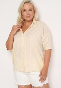 Beżowa Koszula z Bawełny Zapinana na Guziki w Pionowe Paski Tinariss. Odkryj elegancję w klasyce z koszulą Tinariss z linii Plus Size - niezastąpionym elementem Twojej garderoby. Ta koszula o prostej linii posiada modne pionowe paski, nadając Twojej sylwetce smukły wygląd. Wykonana z przyjemnej w dotyku bawełny, zapewnia komfort noszenia przez cały dzień. Długie rękawy i klasyczny kołnierzyk w połączeniu z delikatnym dekoltem w kształcie litery V tworzą spójną całość, idealną jak na codzienne wyjścia, tak i na te bardziej formalne okazje.