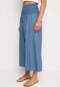 Jasnoniebieskie Bawełniane Szerokie Spodnie Kuloty z Wysokim Stanem i Gumką w Pasie Rafea. Bawełniane Szerokie Spodnie Rafea to kwintesencja miejskiego szyku. Ich wysoki stan wysmukla sylwetkę, a elastyczna gumka w pasie zapewnia dopasowanie. Długie nogawki wpisują się w najnowsze trendy, nadając stylizacjom fashionistki eleganckiego, ale zarazem swobodnego charakteru. Na co dzień zestaw je ze sportowymi butami i luźnym t-shirtem, a wieczorem dodaj szpilki i satynowy top dla szykownego looku na specjalne okazje.