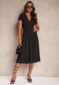 Czarna Sukienka Taliowana z Kopertowym Dekoltem o Rozkloszowanym Kroju Rimadea. Sukienka Rimadea to esencja kobiecości, idealnie wpisująca się w najnowsze trendy modowe. Jej taliowany fason doskonale podkreśla sylwetkę, tworząc rozkloszowany krój, który dodaje lekkości i gracji każdemu ruchowi. Kopertowy dekolt optymalnie eksponuje szyję i pozwala na subtelne wyeksponowanie biżuterii, podczas gdy odpowiednia głębokość dekoltu zachowuje elegancki balans między modą a dobrym smakiem.